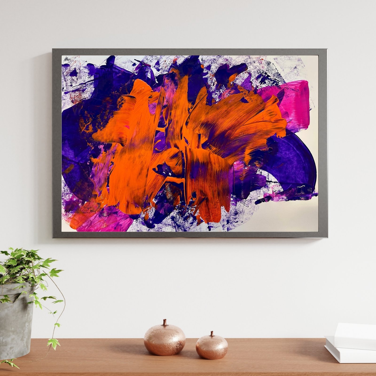Dominant ist ein intensives Orange, das sich mit entschlossenen, breiten Gesten durch dunkle Violett- und Blautöne schiebt. Die Komposition wirkt roh, direkt und körperlich – wie ein Moment, in dem innere Energie nach außen drängt.