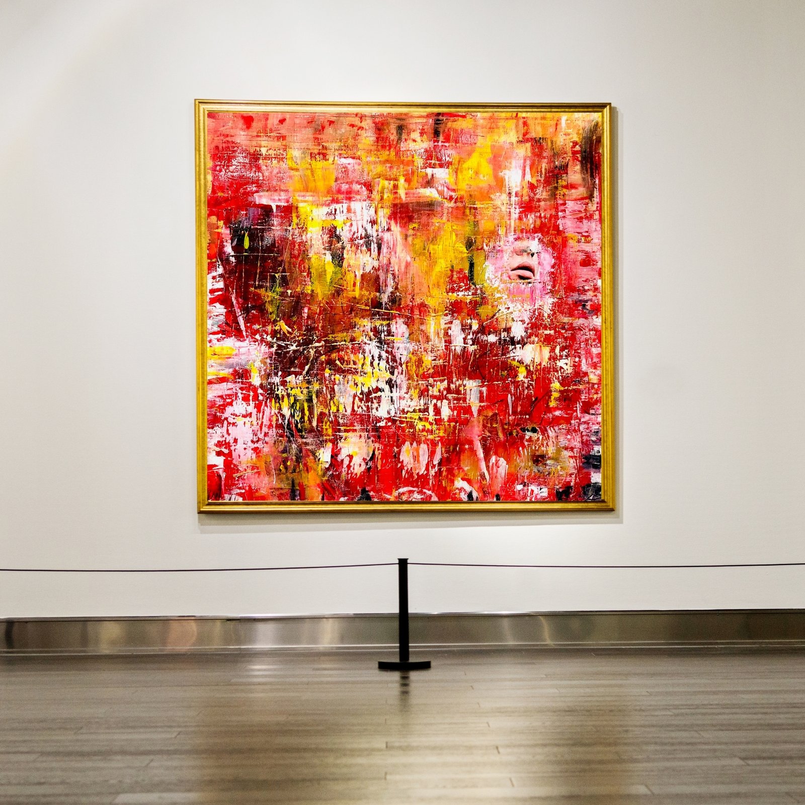 Im Zentrum des visuell intensiven Werks steht ein einziger realer Mund, der aus der abstrakten Struktur hervorsticht und die Grenzen zwischen Realität und Emotion verschwimmen lässt. Die kräftige Farbpalette aus Rot, Gelb, Weiß und Rosa vermittelt Energie, Bewegung und ein Hauch von Provokation.
