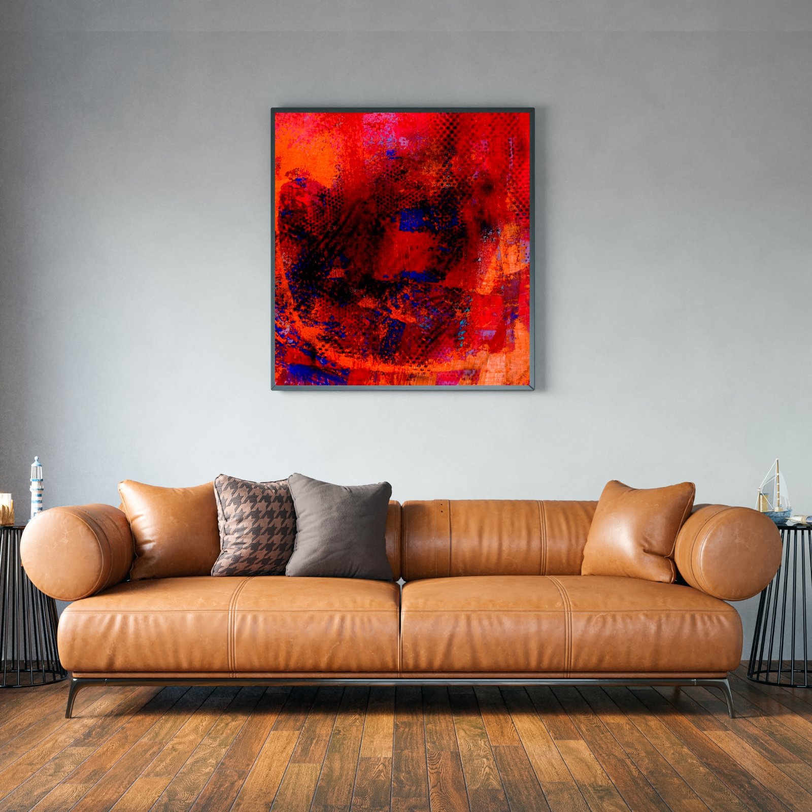 „Pinke Welle – Glutnacht“ ist ein ausdrucksstarkes Werk der Serie Pinke Welle von Verônica Falcão. Diese Komposition ist geprägt von dichten Rottönen, dunklem Blau und violetten Schatten, die sich in dynamischer Textur begegnen. Die Verwendung von Acryl und Lack erzeugt eine vibrierende Oberfläche mit Tiefe und Struktur. Dieses Werk erinnert an das Glühen eines inneren Feuers, das sowohl Kraft als auch Geheimnis ausstrahlt. Ideal für Räume, die Wärme und Intensität ausstrahlen möchten.